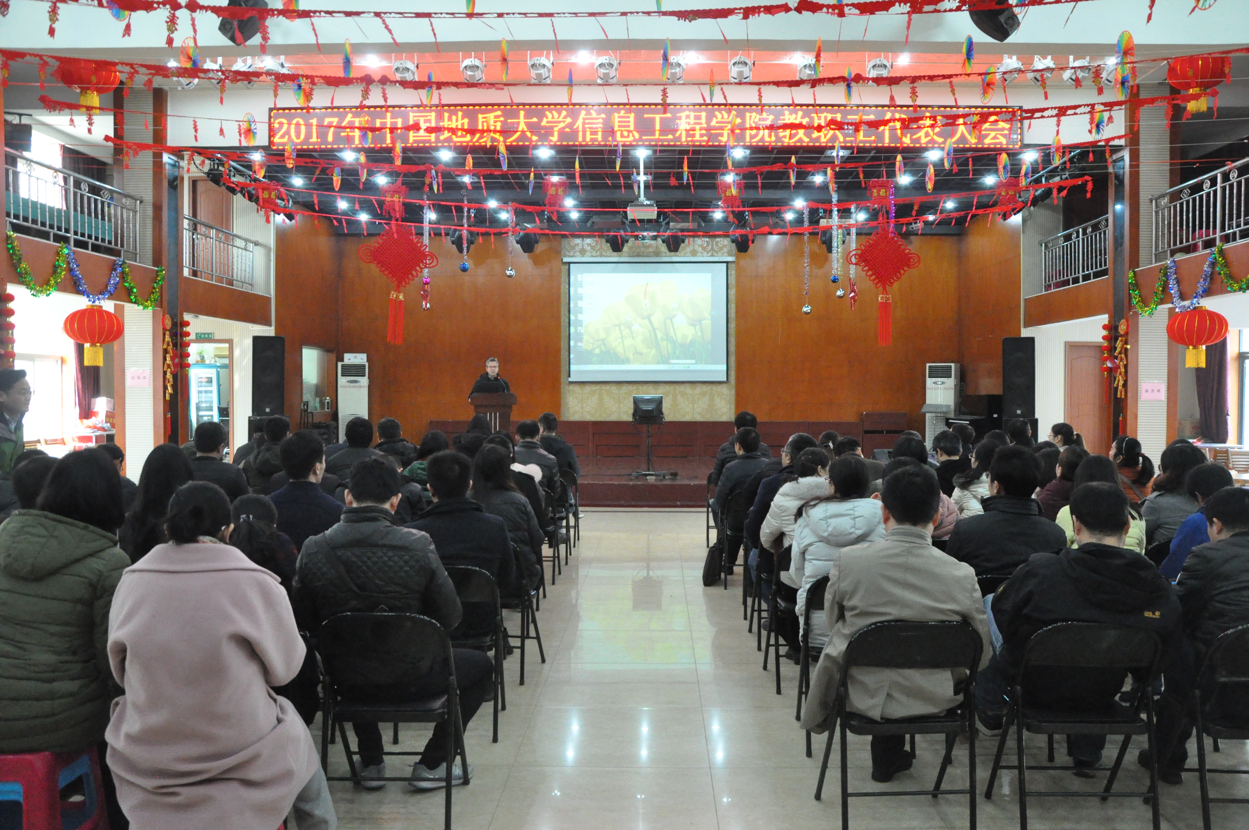 2018年1月23日下午14时,信息工程学院在校工会一楼教工活动中心召开2017年教职工大会。全院教职工参会,由副书记许德华主持,大会的主要任务是审议院长工作报告、学院财经工作报告和工会年度工作报告。