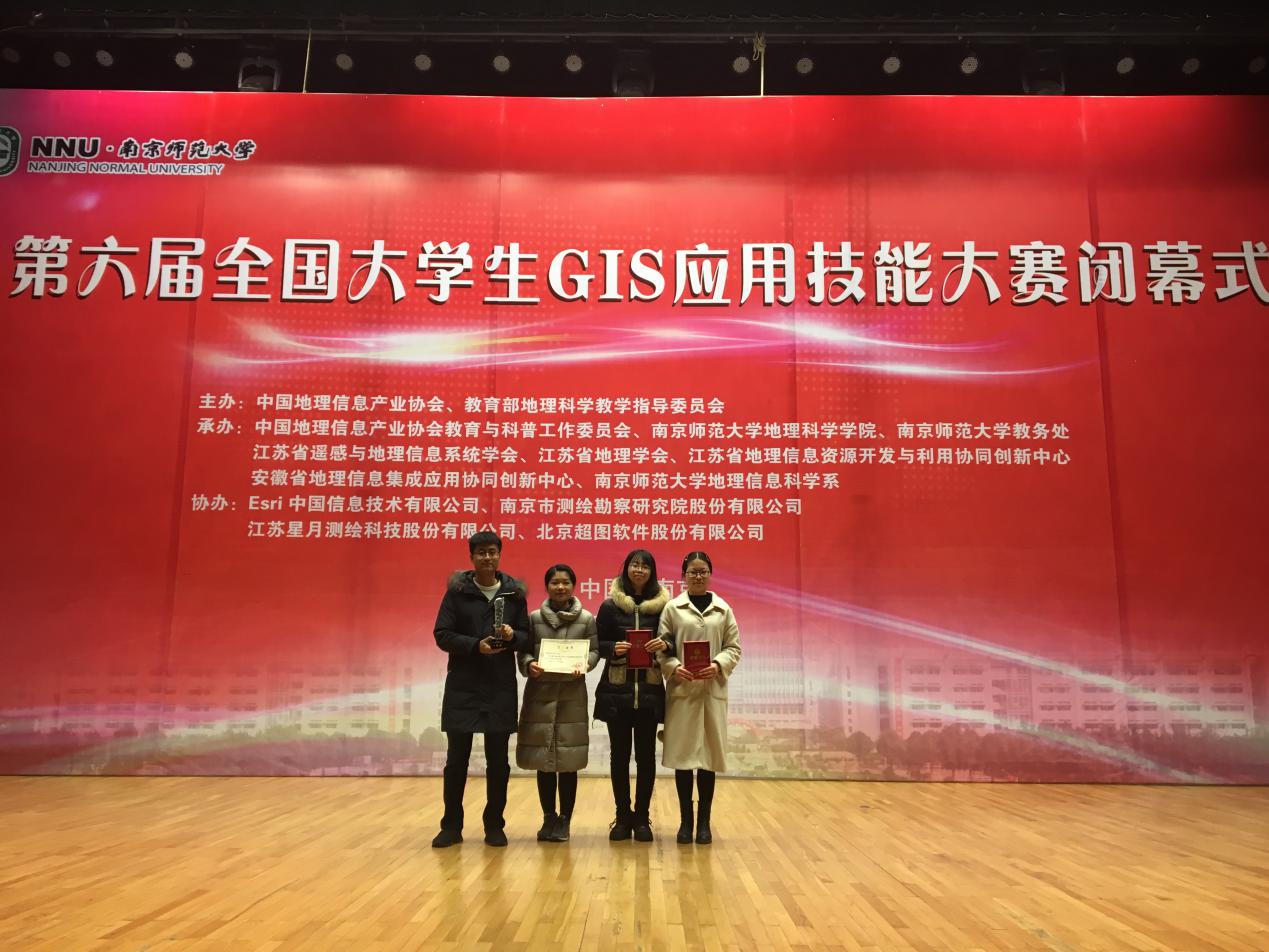 (武汉)代表队在江苏南京参加第六届全国大学生GIS应用技能大赛,获得一等奖。