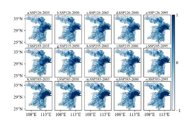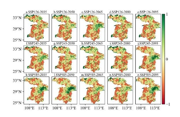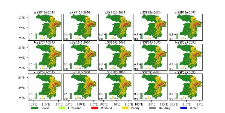 根据预测情景,团队基于斑块生成土地利用变化模拟模型(PLUS,Patch-generating Land Use Simulation Model),选择SSP1-2.6(生态保护型)、SSP2-4.5(一切照旧型)和SSP5-8.5(经济发展型)三种未来情景,实现对未来湿地变化的模拟。相关研究成果在持续推进长江全流域保护,判断湿地生态情况对推进长江全流域保护具有重要现实意义。