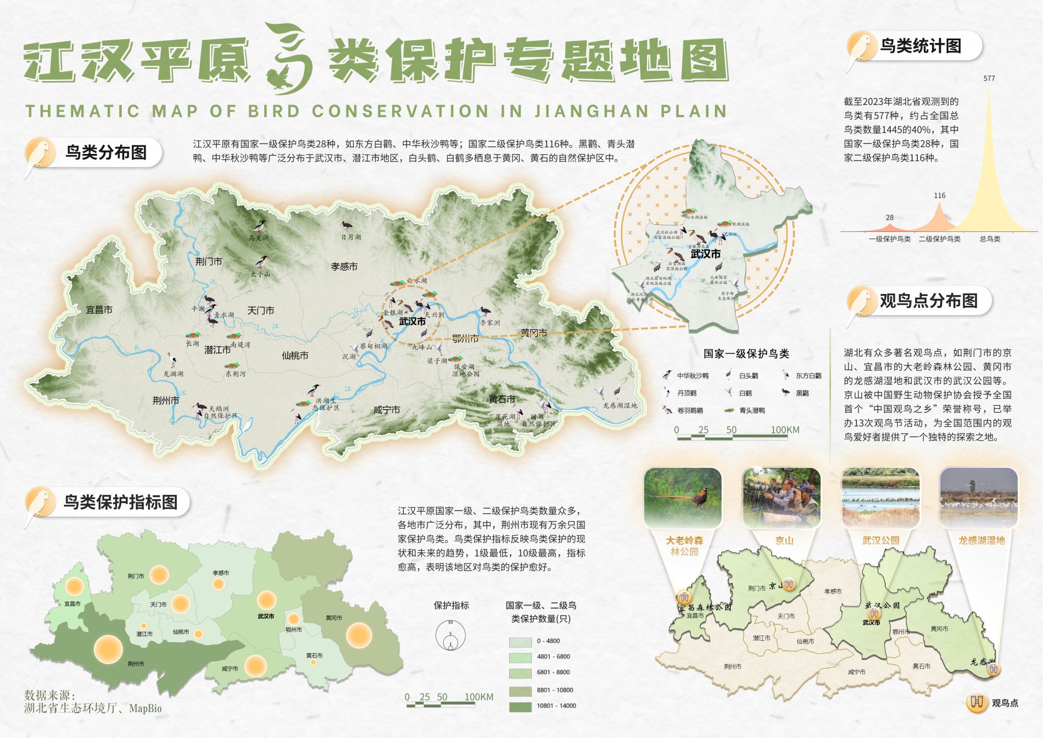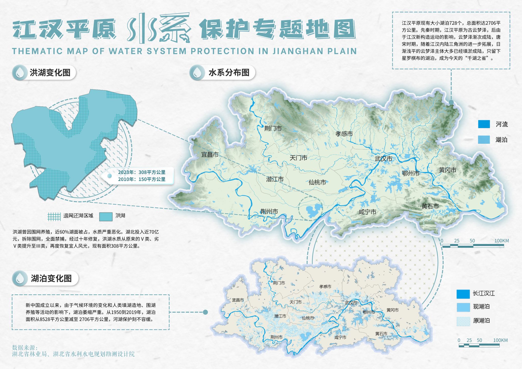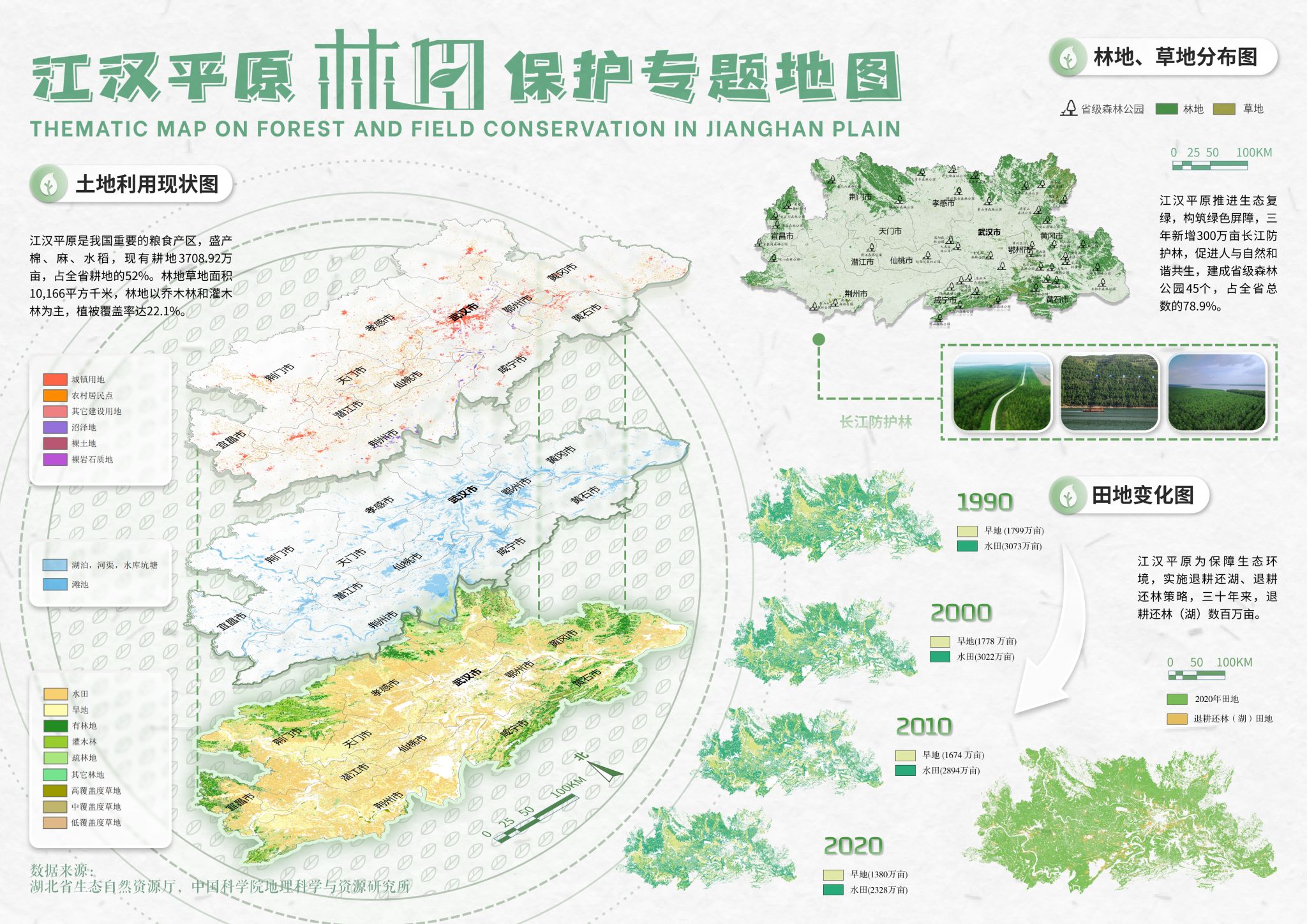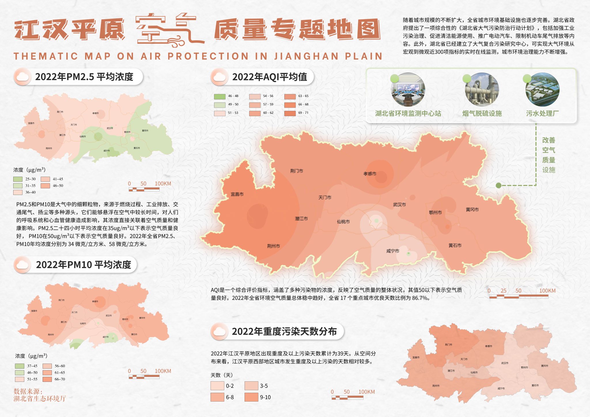 提交的作品为《江汉平原河湖生态环境保护地图》,该系列地图(见下图)贯彻习总书记“山水林田湖草沙”一体化保护修复思想,辅以珍稀动物、空气质量等内容,从多个角度呈现江汉平原河湖生态环境保护状况。