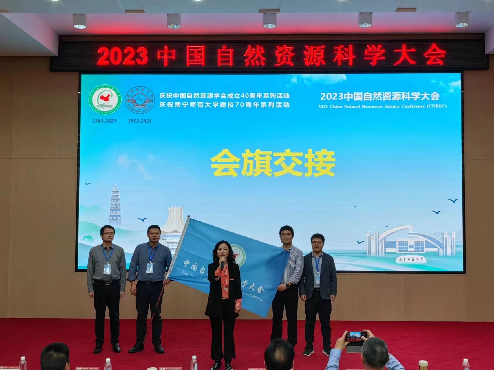 党委书记孙莉接受中国自然资源学会授旗并热忱欢迎专家学者和同学们到访武汉参加2024年中国自然资源科学大会。