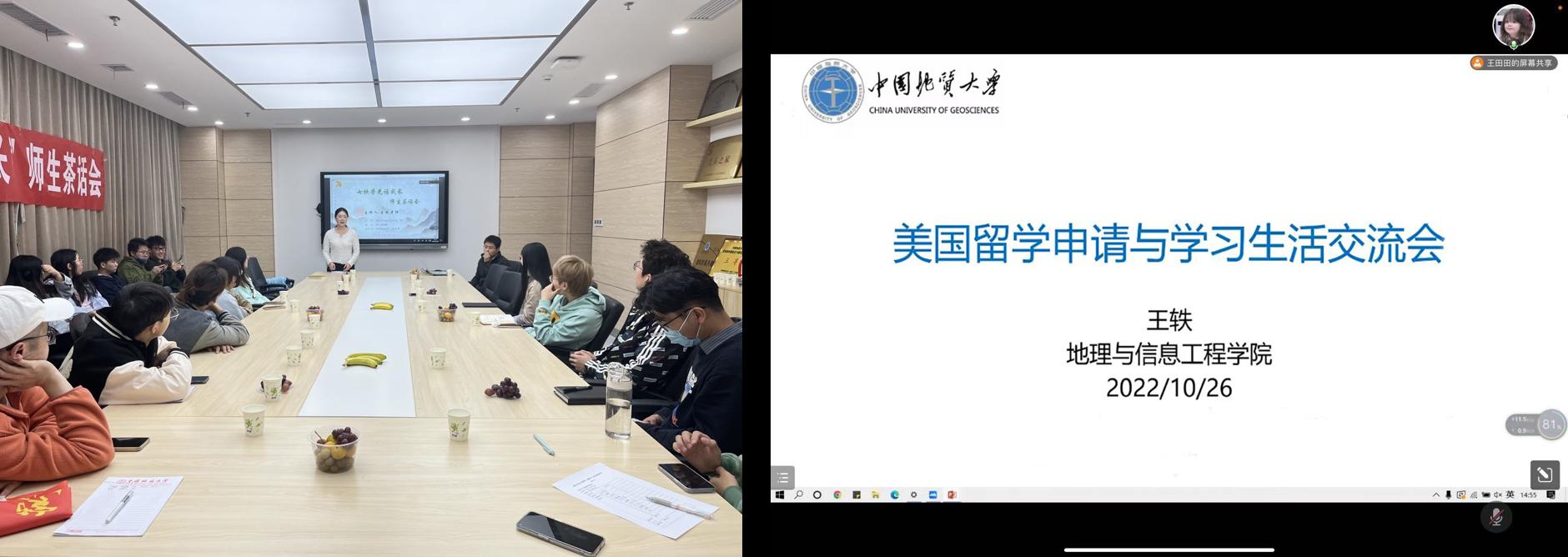 此次茶话会以“美国留学申请与学习生活交流会”为题,由环境遥感团队党支部支部书记、“地大百人”王轶教授主讲,旨在帮助同学们更好的了解留学情况,把握升学就业机会。茶话会由环境遥感团队党支部副书记王田田主持,采用线上线下相结合的方式,吸引了来自学院各专业各年级的六十余名学生参与。