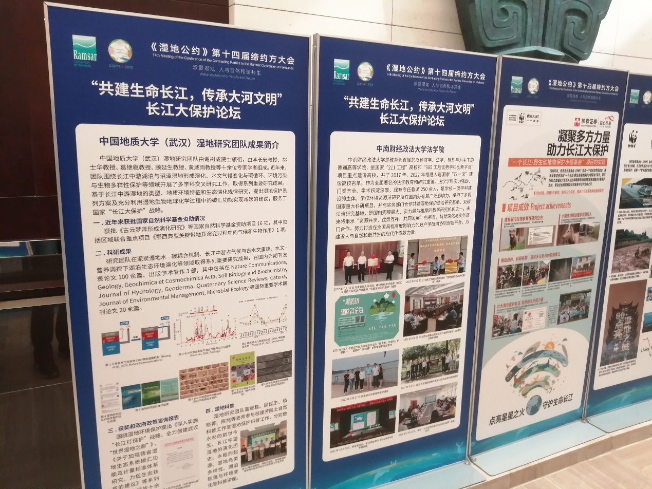 本次主办方还展示了我校湿地研究团队成果展板,介绍了我校湿地研究团队近年来在科研项目、论文成果、政府政策咨询报告以及湿地科普等方面取得的重要进展。我校湿地研究团队成员在本次长江大保护论坛中分享了近年来取得的重要研究成果,扩大了湿地研究团队在国内外知名度。(供稿人:陈旭)