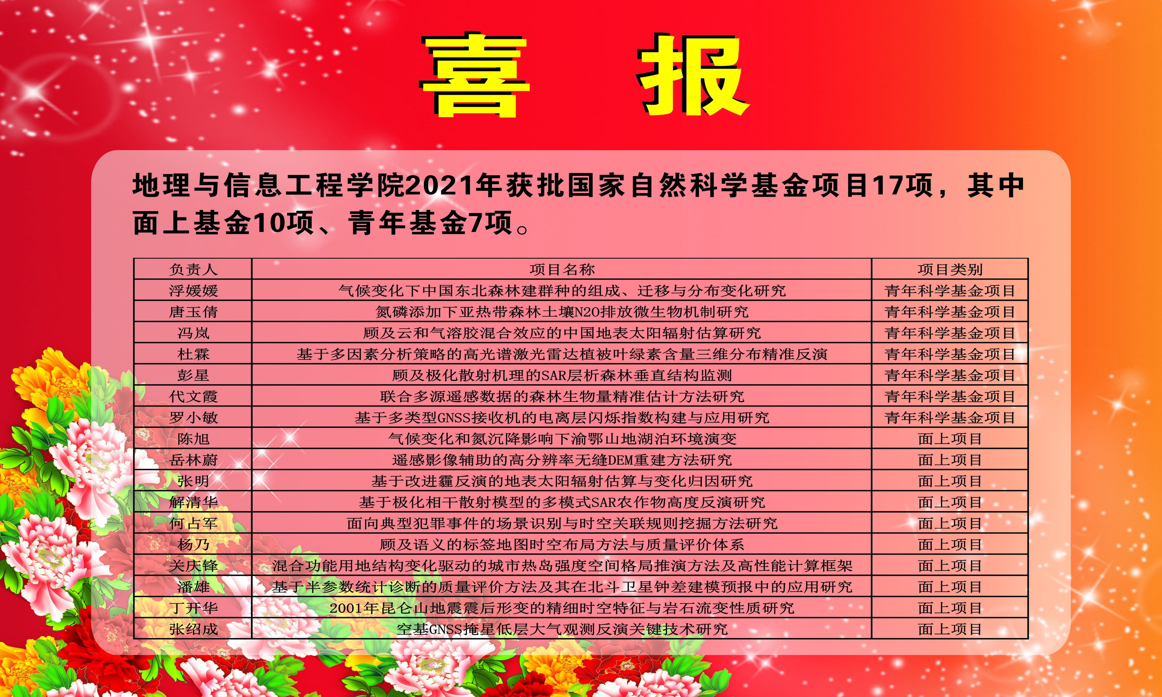 近日国家自然科学基金委员会公布了2021年度国家自然科学基金申请项目评审结果。糖心vlog 共获批国家自然科学基金17项,其中面上项目10项,青年项目7项。在此,特向获得资助的项目负责人表示祝贺!