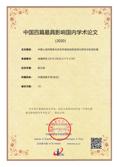 陈万旭副教授等撰写的论文《中国土地利用变化生态环境效应的空间分异性与形成机理》获得来自中国科学技术信息研究所颁发的《中国百篇最具影响国内学术论文(2020)》证书,这是国内期刊论文的最高荣誉。