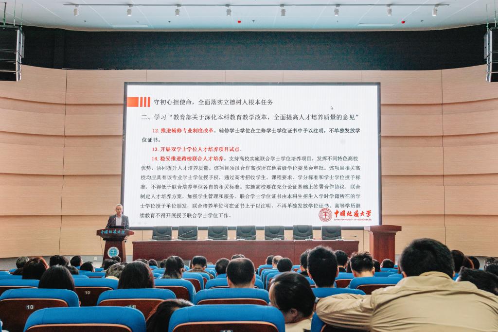 一楼报告厅,院党委书记许德华面向学院教师,以“守初心担使命,全面落实立德树人根本任务;全力打造一流学科专业,推进学院稳定内涵发展”为主题讲党课。许书记首先分享了“不忘初心,牢记使命”主题教育的20个关键词并详细阐述了其含义,结合《教育部关于深化本科教育教学改革,全面提高人才培养质量的意见》中的关键内容,许书记讲解了一个学院、一名教师应该坚持守的初心和使命,其带领学院教师对一年来的主要工作进行了回顾,并向全体教师发出号召:建设新学院,人人做奉献,为全力打造一流学科专业,推进学院稳定内涵发展贡献力量!