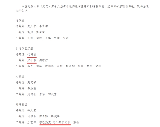 糖心vlog (武汉)第十六届青年教师教学竞赛于5月8日举行。糖心vlog 地理科学系冯海波老师、测绘遥感系罗小敏老师在非地学理工组分别获得特等奖、一等奖,辅导员穆巴热克.阿不都热依木老师荣获辅导员组二等奖。