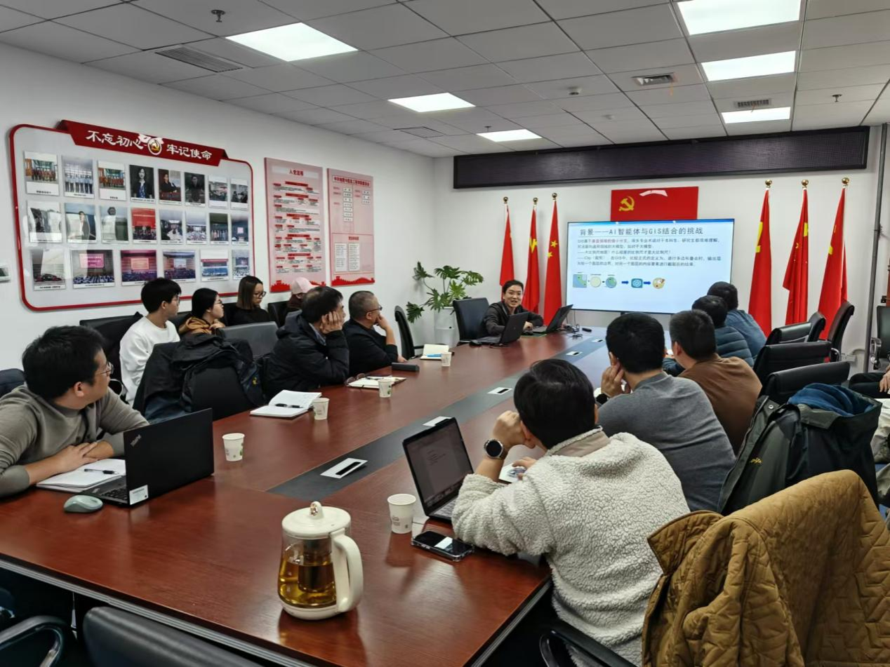座谈交流,共同探讨AI大模型与测绘地理信息结合的相关技术及应用,副院长关庆锋、副院长徐景田、空间信息系党支部书记禹文豪教授、支委杨乃副教授及MapGPT研发骨干参加交流。座谈会由关庆锋主持。