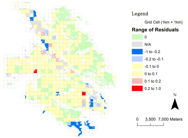 (4) 利用上述关系计算各个地理单位的残差,并评估该指标(建筑密度)的有效性。