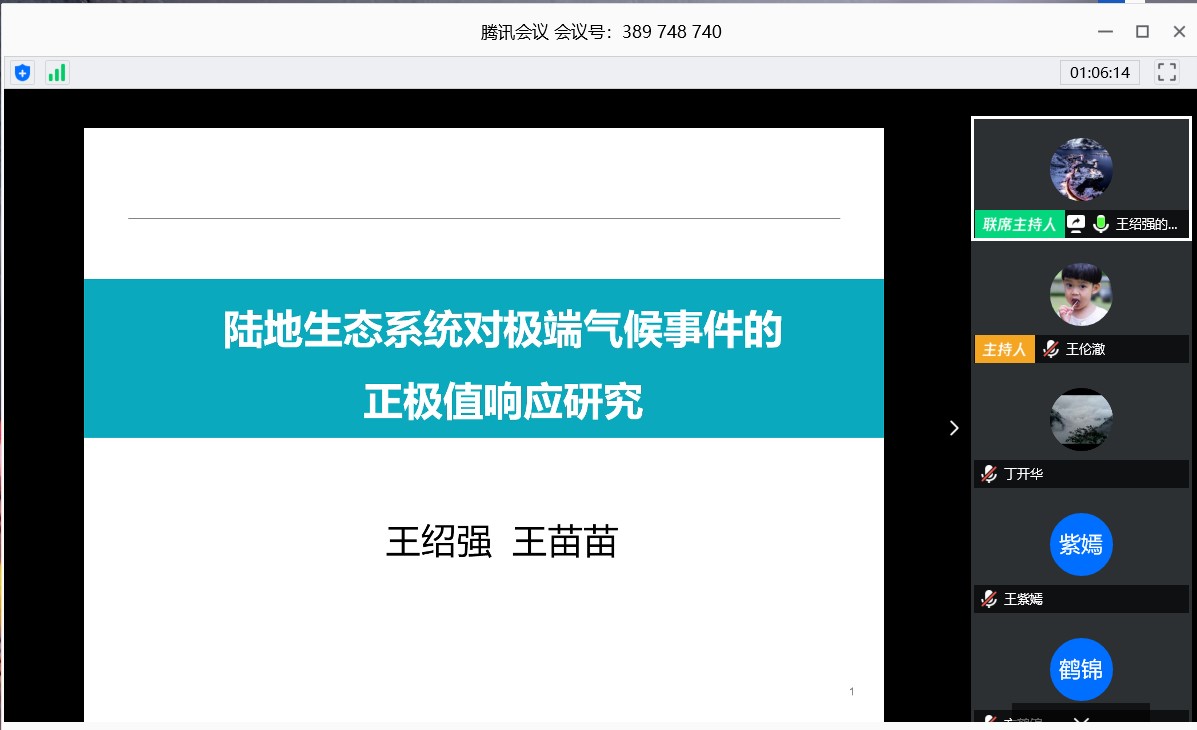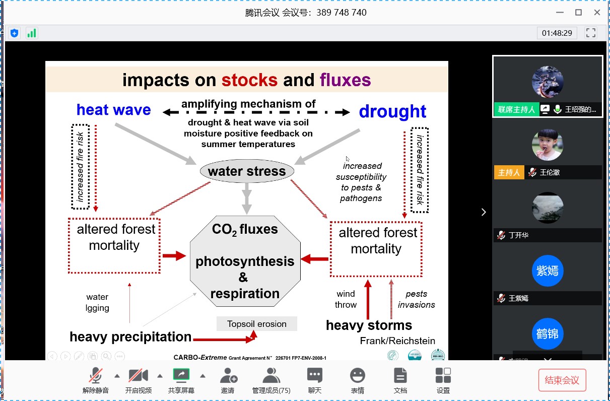 院长王绍强教授通过在线授课平台,进行了“陆地生态系统对极端气候事件的正极值响应研究”主题讲座,本次讲座由王伦澈副院长主持,100余名师生在线聆听了讲座。
