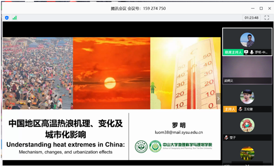 2020年4月22日下午,中山大学罗明副教授应邀通过我校在线授课平台进行了“中国地区高温热浪机理、变化及城市化影响 ”主题讲座,本次讲座由王伦澈副院长主持,180余名师生在线聆听了讲座。