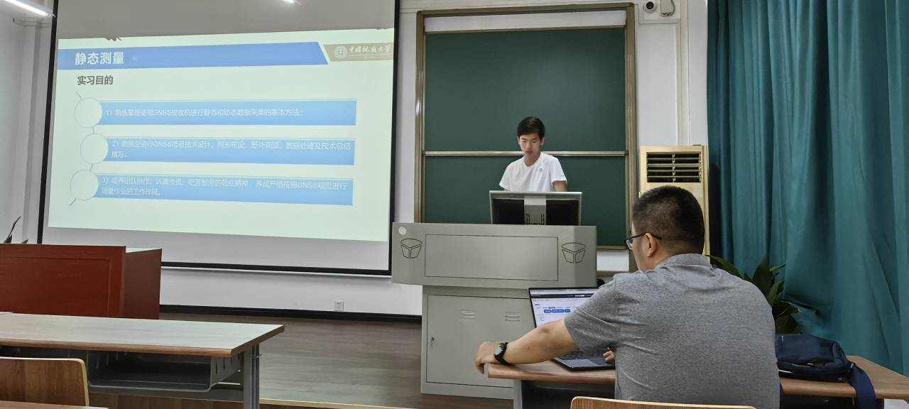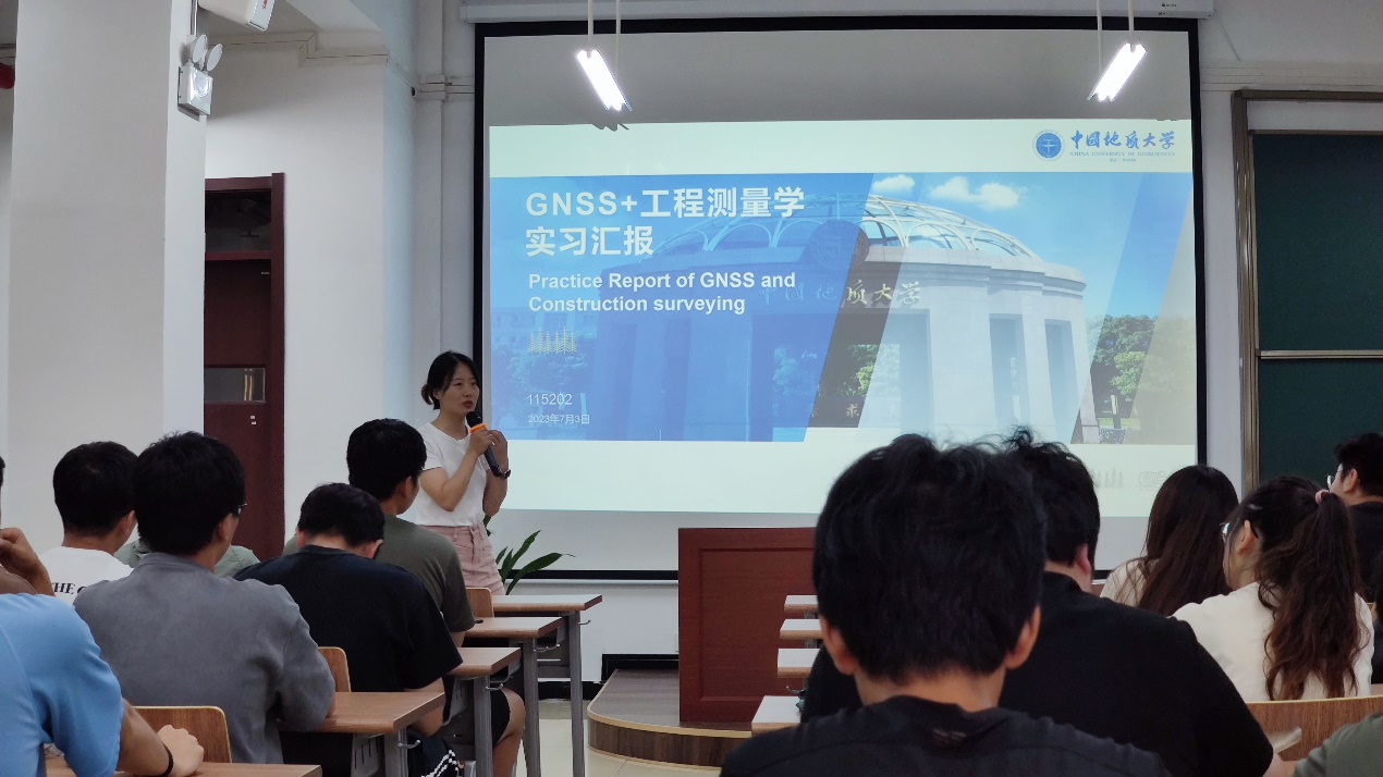 总结汇报期间,各实习学生代表围绕GNSS静态测量、跨河水准与三角高程测量比较、GNSS高程异常拟合、RTK测量与放样、巴东基地野外实习等内容展示实习小组工作成果,同时,对测绘工程专业的课程建设、实习内容提出建议。