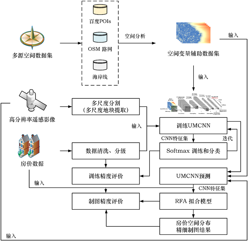 通过采集搜房网(Fang.com)提供的房价数据和多源空间数据,本研究在前人研究的基础上,考虑到中国城市房价存在的复杂空间异质性,建立了一种基于深度学习有效融合多源空间数据(高分辨率遥感影像、百度POIs数据和基础地理信息数据等)的房价制图模型,以实现精确、合理的高分辨率城市房价空间分布精细制图。本研究提出了一个联合挖掘-卷积神经网络(Convolutional neural network for united mining, UMCNN)模型,用于挖掘和融合研究区(深圳市)内的多源空间数据及与房价相关的自然物理和社会经济信息,获取深圳市的房价精细分布数据。通过和多种基于多源空间数据融合的房价制图方法进行对比,来论证本章节提出的方法的优势和准确性。