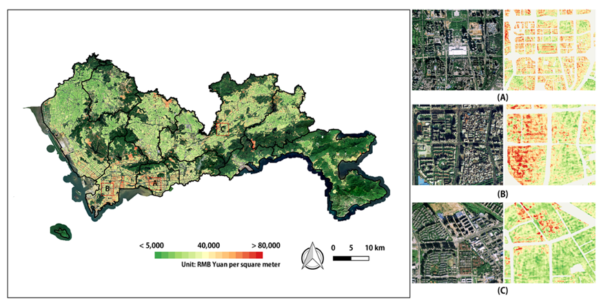 3深圳市房价空间分布精细制图结果:(A) 福田区的深圳市民中心;(B) 南山区南头街道(深圳市关内和关外交界处);(C) 龙岗区中海地产
