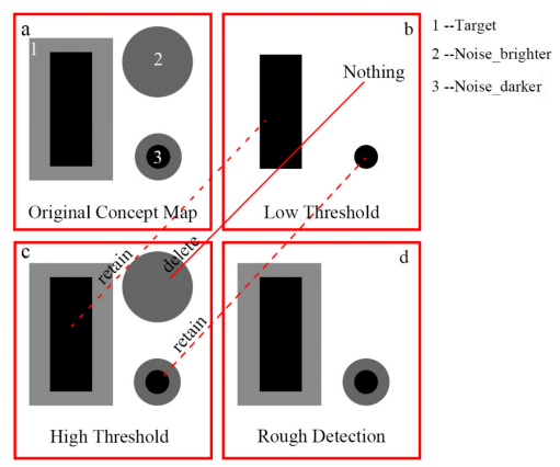 Figure 1. Concept map of Low-High threshold detection strategy. And (a) is the conceptual map consists of noise, dark target and bright background. (b) is the conceptual map of detected result using a low threshold. (c) is the conceptual map of detected result using a high threshold. (d) is the conceptual map of rough detection result using the low-high threshold detection strategy.