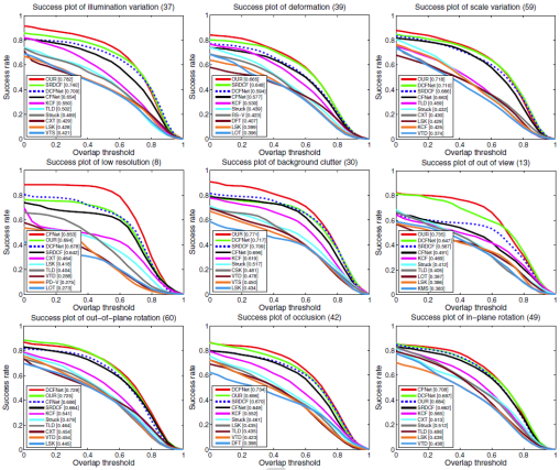 本研究与现有的跟踪算法在九个典型视频序列上的OPE成功率比较如图3所示。PSRDCF在目标消失、背景嘈杂、尺度变化、外平面旋转以及低分辨率等情况下均能保持较高的成功率。