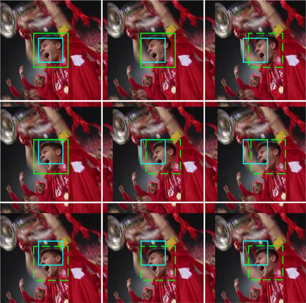 目标跟踪作为计算机视觉领域最重要的研究问题之一,在人机交互、车辆识别、视频监控等行业有着广阔的应用前景。近年来基于相关滤波的跟踪算法(例如KCF、MOSSE、SRDCF等)在目标跟踪任务中展现出了良好的性能。这些方法利用训练样本的周期性假设来针对不同的图像分块学习各自的分类器,在实现分块跟踪的同时也引入了不必要的边界效应(如图1所示)。绿色矩形表示目标区域,蓝色矩形表示正则化相关滤波器的学习区域。由于惩罚项的影响,相关滤波器只关注于训练图像块的中心位置,导致相关过滤器只提取某些图像块中目标的局部特征(如图中绿色虚线矩形)。