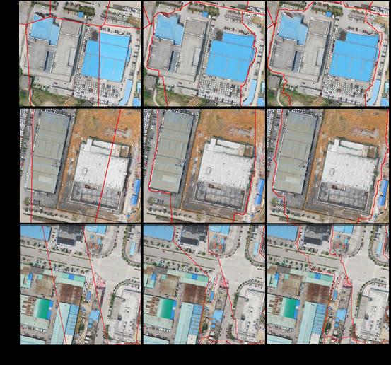 图 4.初始镶嵌线以及使用新老算法优化后的镶嵌线对比。(a)、(b)、(c)三行分别表示三个不同的区域。第(i)列为初始镶嵌线,第(ii)列为老算法提取的镶嵌线,第(ii)列为本文算法提取的镶嵌线。