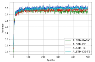 Here, ALSTM-BASIC is the model composed of the post words embedding component and the LSTM component. ALSTM-DE is the model that includes the post words embedding component, dictionary embedding component and the LSTM component. ALSTM-TE is the model composed of the post words embedding component, temporal information embedding component and the LSTM component. ALSTM-DE-TE is the model composed of all the components