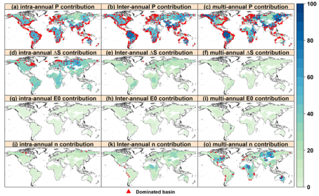 研究结果表明,降水变化是全球径流变化的最主要原因,其对全球径流年内、年际和多年变化的平均贡献率分别为83%,98.3%和86.7%。陆地储水对全球径流变化的贡献率随着时间尺度的增加而减少,其对年内尺度径流变化的贡献率明显大于对年际和多年尺度的贡献率。陆地储水主导了中高纬大部分流域径流年内变化,主要包括加拿大北部、欧洲北部、亚洲西北部等地区。潜在蒸发变化对全球径流变化的影响相对较小。下垫面变化主导了全球13.1%流域年际尺度径流变化,其影响普遍远大于陆地储水变化和潜在蒸发变化对多年径流变化的影响。因此,径流变化相关研究,在长时间尺度上应该考虑下垫面的作用,而短时间尺度上必须考虑陆地储水变化的影响。