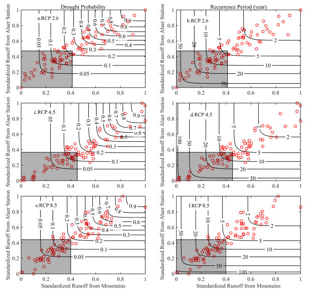 该研究发现,在同时考虑上游农业发展和中下游生态发展的前提下塔里木河流域历史水文干旱风险概率为0.25,干旱重现期为4年(图4),未来三种气候情景下的水文干旱风险分别为0.23, 0.15和0.18,干旱重现期为4.3年,7年和5.6年(图5)。