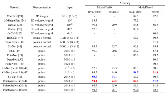 与发表在CVPR 2019的论文在ModelNet40和ModelNet10数据集上的分类定量比较结果如表1所示。