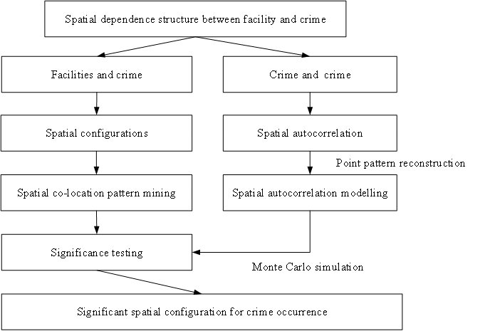 空间同位模式挖掘是时空数据挖掘的主要研究内容之一,亦是探索多类型地理要素之间复杂非线性作用的有力工具。为此,本文借助空间同位模式挖掘算法来探索犯罪事件与空间环境(城市设施组合)的复杂关联分析,整个方法流程如图1所示。首先,将这种复杂关系拆解为“犯罪事件之间的空间自相关”与“城市设施与犯罪事件的空间依赖”两部分,进而,分别采取空间点模式拟合、空间同位模式挖掘方法对空间自相关结构、空间依赖结构进行定量化建模;最后,借助空间统计推断方法,对其中的具有统计显著性的空间关联模式进行提取。实验结果表明,本文所采取的空间同位模式可以有效消除非关联设施的干扰,更好的揭示犯罪事件的频发空间场景,从而为预防犯罪和城市规划起到一定的指导作用。