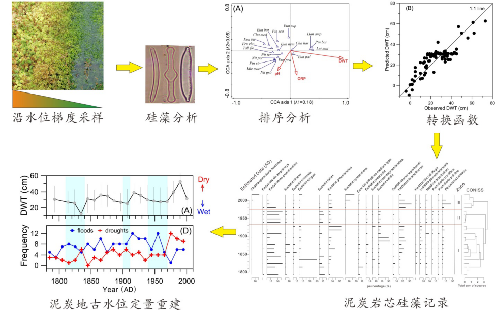 研究过程简要说明:在泥炭地沿水位梯度采集表层泥炭藓样品,样品经过预处理后在生物显微镜下进行硅藻鉴定分析,在R语言调用vegan软件包进行排序分析,确定影响硅藻分布的主要环境变量。在此基础上,调用rioja软件包建立硅藻-水位转换函数模型,并对模型的效果和空间自相关影响进行评估。同时,对泥炭岩芯进行Pb210测年和硅藻分析,将沉积硅藻组合数据代入到转换函数模型,重建泥炭地古水位变化,并与区域古水文资料进行对比,验证重建结果可靠性。