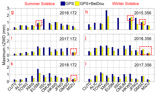 论文研究表明,二阶电离层延迟对估计ZWD的影响可超过3mm,采用GPS/BDS集成可以在一定程度上降低二阶电离层延迟的影响。但BDS系统的静止轨道卫星观测数据,因其信号受电离层最为活跃的赤道区域的影响,在电离层较为活跃的地方时中午时段,GPS/BDS集成可能会给ZWD评估带来更大的误差。