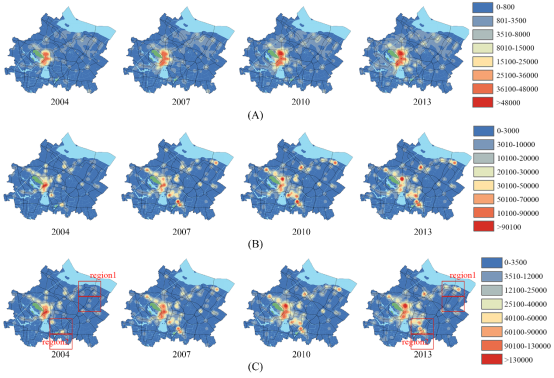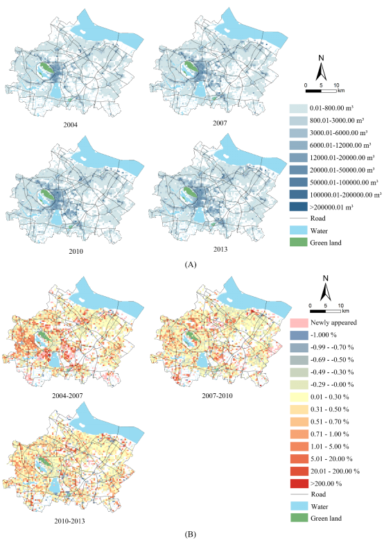 2004-2013年,用水用户(尤其是居民类型)的数量逐渐增加,非居民用户中,制造业和商业在过去几年中出现了大幅增长。如图2所示,非零用水的网格比例从5485个网格的46.73%增加到55.31%,平均每个网格的用水量从1,897.36m³增加到2,674.3m³。另外,存在用水量较高(热点)的区域,表明了社会经济活动的空间集中度。图2B表明,用水量快速增长的地区在早期(即2004-2007年)集中在市中心附近,然后逐渐分散。