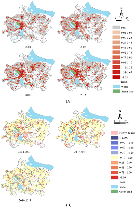 高度混合的网格集中在城市中心和城镇中心,这表明较高的城市化程度和相对稳定的工作居住混合区域,居民可更方便地使用各种设施。 此外,由于道路是几乎所有类型的社会经济活动集中关键因素之一,一些高度混合的网格沿路分布。
