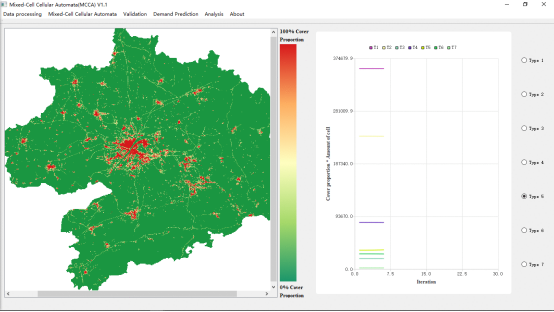 混合元胞CA模型的软件现已发布,包括完整用户手册和测试数据,供全球研究者免费下载。支持算法并行和模拟过程可视化(图8)。下载链接为://github.com/HPSCIL/Mixed_Cell_Cellullar_Automata 或 //www.urbancomp.net/2020/07/25/mixed-cell-cellular-automata-mcca/