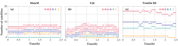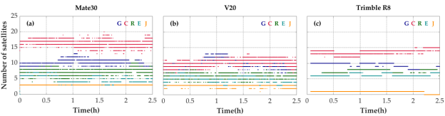 图 1 Mate30(a)V20(b)和Trimble R8(c)观测到的具备单频GNSS信号的各系统卫星数