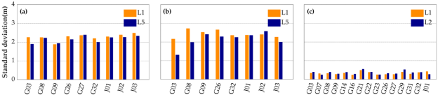 图 4 Mate30(a)V20(b)和Trimble R8(c)各卫星各频点MP组合标准差