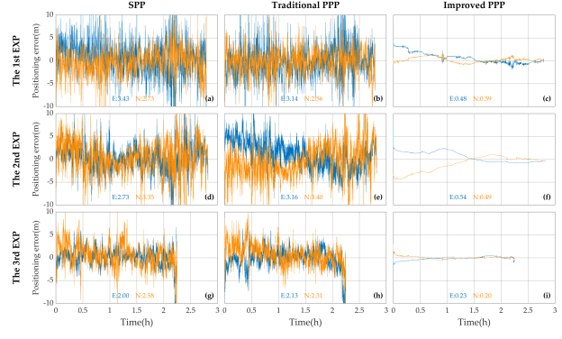 图 5 三次静态观测中Mate30智能手机使用SPP(a、d、g)、传统PPP(d、e、h)和改进PPP(c、f、i)方法后平面定位结果误差及标准差