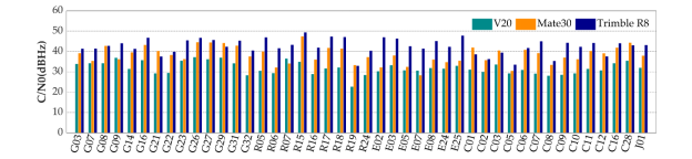 图 3 Mate30(青色)、V20(橙色)和Trimble R8(蓝色)各卫星信号平均载噪比