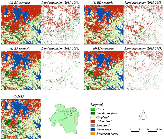 图8. 不同情景下2035年模拟土地利用模式的局部细节和2013年至2035年的土地扩张图