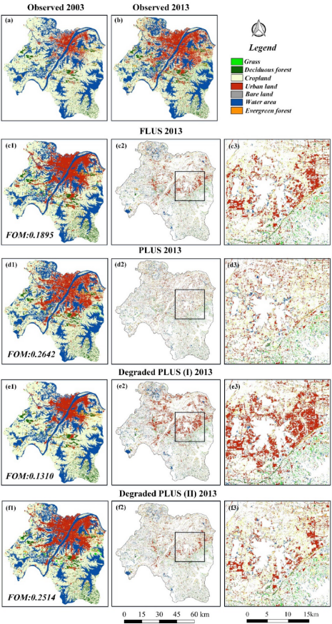 图5对比了2013年真实的土地利用格局与四种模型的模拟土地利用格局。我们发现,PLUS模型的模拟结果(图5(d))与真实格局(图5(b))最为相似,并获得了最高的模拟精度(FOM=0.2642)。c2-3,d2-3,e2-3和f2-3面板显示了四个模拟模型模拟的不正确的斑块的分布。由PLUS模型模拟的不正确斑块较小,且均匀地分布在研究区域内。其他模型相比PLUS则有许多明显而大的不正确斑块。PLUS模型的模拟精度(图6(d))与退化的PLUS模型(I)(图6(e))的对比表明,LEAS在提高模拟精度方面具有很大的优势(FOM从0.1310提高到0.2642)。PLUS模型的模拟精度高于退化的PLUS模型(II)(图6(f)),说明本研究提出的多类型随机斑块种子机制有助于提高模拟结果的精度(FOM从0.2514增加到0.2642)。最后,PLUS模型与FLUS模型的FOM值对比(0.2642与0.1895)表明,PLUS模型模拟历史土地利用变化的精度优于传统模型。