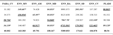 我们还验证了PLUS模型与其他模型相比是否能更好地捕捉景观模式的变化。我们通过对2013年一系列模拟和真实的景观指标进行比较对景观相似度进行了量化。我们共选取15个景观指标:(1)斑块数量(NP);(2)最大斑块指数(LPI);(3-8)周长面积比指标,包括平均值(PARA_MN)、加权平均值(PARA_AM)、中值(PARA_MD)、极值(PARA_RA)、标准差(PARA_SD)、变异系数(PARA_CV)。(9-14)为欧氏最近邻距离指标,包括均值(ENN_MN)、加权平均值(ENN_AM)、中值(ENN_MD)、极值(ENN_RA)、标准差(ENN_SD)、变异系数(ENN_CV);(15)同类相邻比例(PLADJ)。我们使用的景观指标如表3所示。