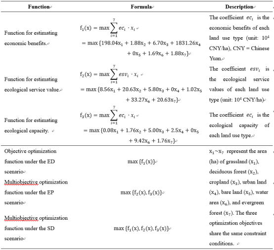 多目标优化(MOP)是一种开放灵活的方法,可以纳入各种生态和宏观经济政策。通过适当定义的目标优化函数和约束条件,可以考虑到规划者的期望(如土地利用多样性)和关注的变量(如粮食需求等)。本研究参考Wang等(2018)提出的目标优化函数、约束条件和参数预设了三个优化目标。(1)经济效益最大化;(2)生态服务价值最大化;(3)生态容量最大化。在我们的研究中,假设最优的可持续土地利用结构同时最大化这三个目标,并据此设计了一个可持续发展(SD)情景。此外,我们还定义了使土地利用的经济效益最大化的经济发展情景(ED)和使土地利用的生态效益最大化的生态保护情景(EP),以更好地比较SD情景下的土地利用模式。MOP的优化目标列于表1中。这些目标函数的约束条件如表2所示。