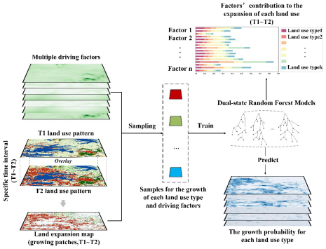 本研究提出的LEAS需要两期的土地利用数据。首先将两期的土地利用数据进行叠加,提取两期数据之间变化的部份,即从第二期土地利用数据中提取状态发生变化的栅格。然后随机选取采样点,并根据其土地利用类型分别进行训练(图3)。例如,当我们对某一土地利用类型的扩张与驱动因素之间的关系进行挖掘时,我们将该类型扩张的样本的标签设置为 "1",其他样本的标签设置为 "0"。接下来,使用随机森林算法,对每一类用地的数据进行训练,获得不同土地利用类型扩张规律的转化规则。
