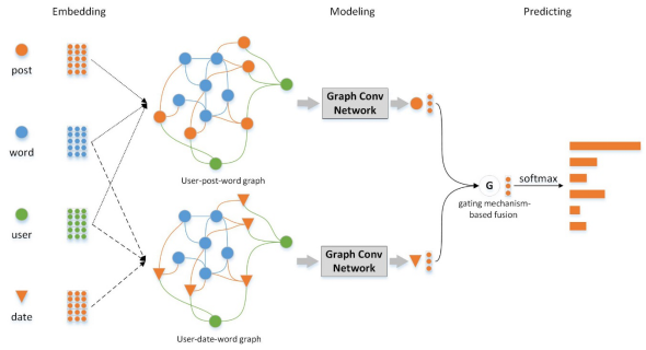 1)为了有效地对隐藏在社交媒体信息中的交互信息进行建模,本研究从文本和时间两个角度进行考虑,不仅可以构建帖子文本内容和用户之间的关系,同时还可以利用日期编码方法来捕获用户在不同时间的活动模式。