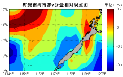 (4)结果分析:本文对反演结果与OSCAR 海流产品进行了对比分析。将经验模型算法获取的海流u 分量和v 分量与OSCAR 海流u 分量和v 分量做相对误差处理,获得相对误差图,如图6、7所示,从图中可以看出u 分量相对误差最高达到了0。6 m/s,在接近北纬10°的位置,误差达到最大。而v 分量的相对误差明显比u分量的相对误差要小,最大只达到了0。4 m/s,且在距离赤道越近的位置,误差越大。