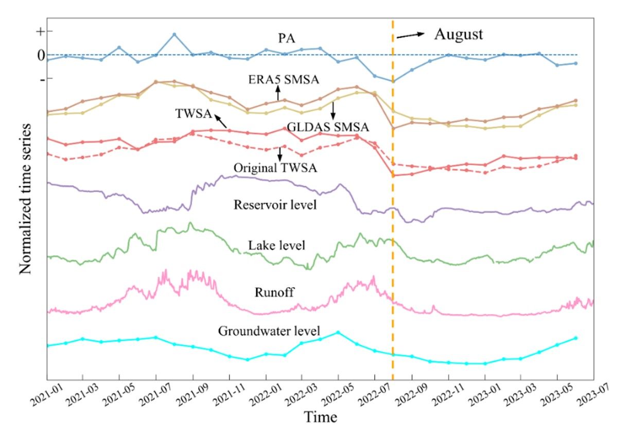 图2 2021年到2023年7月间不同水文变量的标准化时间序列