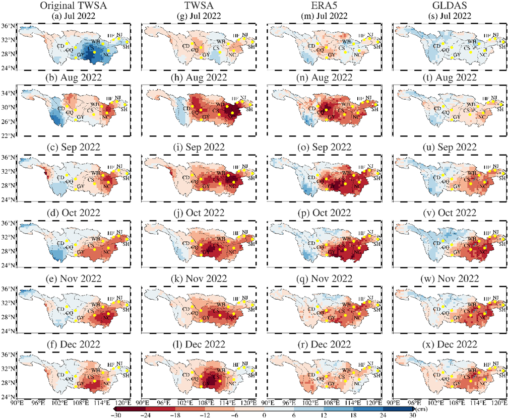 图1 2022年7-12月长江流域的陆地水储量异常(a-f),扣除趋势项和季节项的陆地水储量(g-l)以及ERA5(m-r)和GLDAS的土壤水储量异常(s-x)空间分布