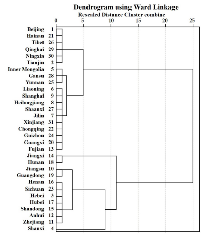本研究使用2016年中国31个省级行政区(港澳台除外)废水中12种主要污染物(化学需氧量(COD)、氨氮、总氮(TN)、总磷(TP)、石油类、挥发酚、铅、汞、镉、砷、总铬、六价铬)的排放数据,利用主成分分析分析(Principal component analysis,PCA)和聚类分析(Cluster analysis,CA)方法,将31个省份进行聚类并讨论不同类型地区的主要污染来源,由此提出相关污染防控策略。研究结论主要如下: