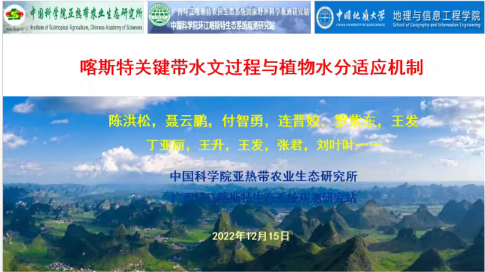 陈洪松研究员首先向参会师生介绍了全球喀斯特地貌的特点及分布特征,指出喀斯特关键带的核心是土壤-表层岩溶带系统,接着向大家介绍了关于喀斯特关键带研究的进展:包括多界面水文过程与特征、关键带结构与水文特征、流域水文过程与生态效应、植物水分来源与适应机制,得出了土壤厚度是决定降雨-径流关系的关键环境因子、岩性控制关键带结构和水文特征等结论,并对未来的研究进行了展望。