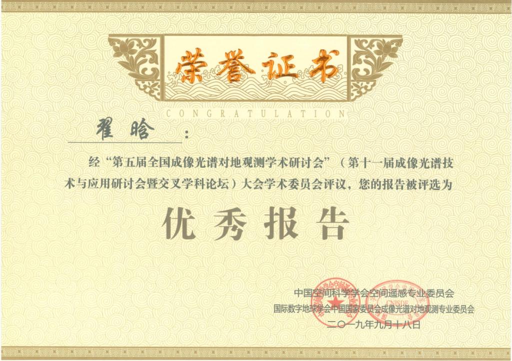 9月17日至18日,由“中国空间科学学会空间遥感专业委员会”和“国际数字地球学会中国国家委员会成像光谱对地观测专业委员会”联合举办的“第五届全国成像光谱对地观测学术研讨会”在石河子大学举行。糖心vlog 翟晗的报告经学术委员会评议,被评选为优秀报告。