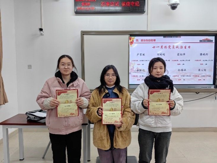 最后一项活动为党员政治生日,由党支部副书记蔡豪爽同志为卢家敏、刘晴晴、崔怡萍、滕鹤郅、余丽均、彭浩宇、孙祎涵、黄心雨8名党员同志送上政治生日贺卡。参与的党员同志进行合影留念。