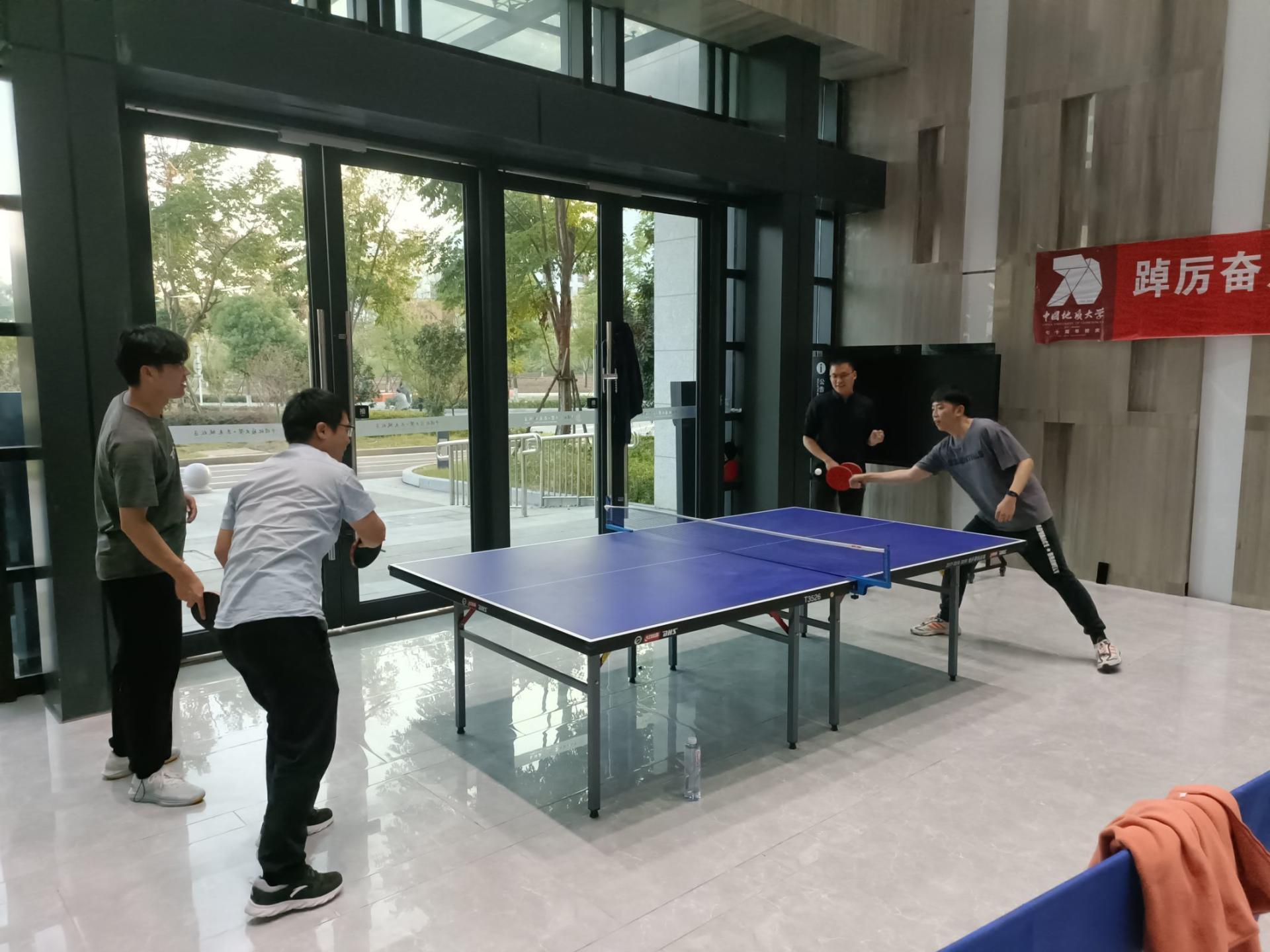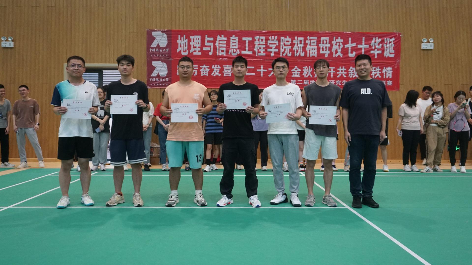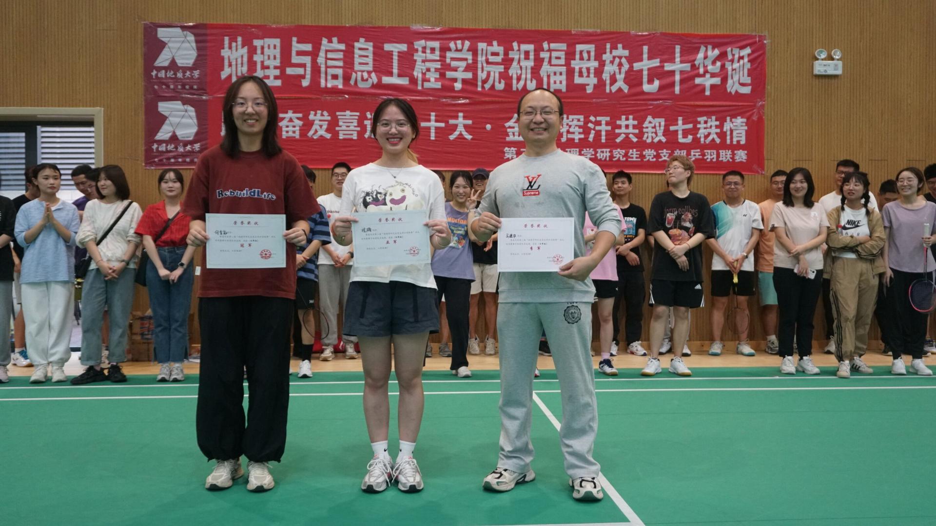 乒乓球项赛事共设立男单、女单、男双、女双、混双5个项目,参赛队伍达40队,五个项目共对阵40场。经过激烈角逐,空间规划团队党支部王凯、郭倩钰分别斩获男单、女单冠军;空间规划团队党支部王凯、张印和全球变化团队党支部任明煊、程楠分别荣获男双、女双冠军;环境遥感团队党支部黄荷、洪郁宁获得混双冠军;空间规划团队党支部荣获乒乓球项赛事团体总分第一名。刘剑宇和罗增良分别为获奖选手进行颁奖并进行合影留念。